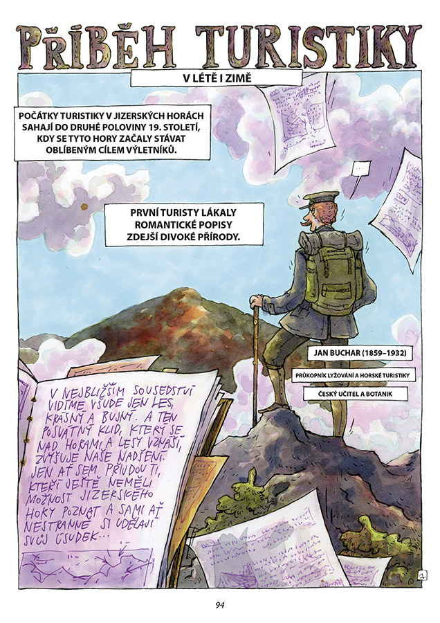 Přesto onen koncept dál žije, aktuálně v sérii scenáristy Radka Drahného (nar. 1976) věnované historii největších českých pohoří: v roce 2021 to začalo Příběhy z Krkonoš v komiksech, které napsal Jiří Louda a kreslil Tomáš Chlud, a následovaly Příběhy ze Šumavy v komiksech, jež vytvořil Drahný s kreslířem Davidem Škodným. S Chludem se Drahný spojil v roce 2023, kdy vytvořili kolekci Příběhy z Orlických hor v komiksech a loni na sklonku roku přibyly Příběhy z Jizerských hor. Všechny vydalo rodinné nakladatelství (majitelkou je Zdeňka Drahná) Green Mango sídlící ve Vrchlabí a specializující se právě na populárně-naučné knihy o Krkonoších; možná i proto celostátní média zmíněnou sérii opomíjela. Přitom je přinejmenším svým rozsahem obdivuhodná: brožované publikace formátu A4 mají vždy přes 100 plnobarevných stran, přičemž vyšly v rozmezí pouhých pěti let. Především od kreslíře Chluda je to skoro heroický výkon, zvláště při vědomí, že komiksy nekreslí na plný úvazek, ostatně jako skoro nikdo z českých výtvarníků.